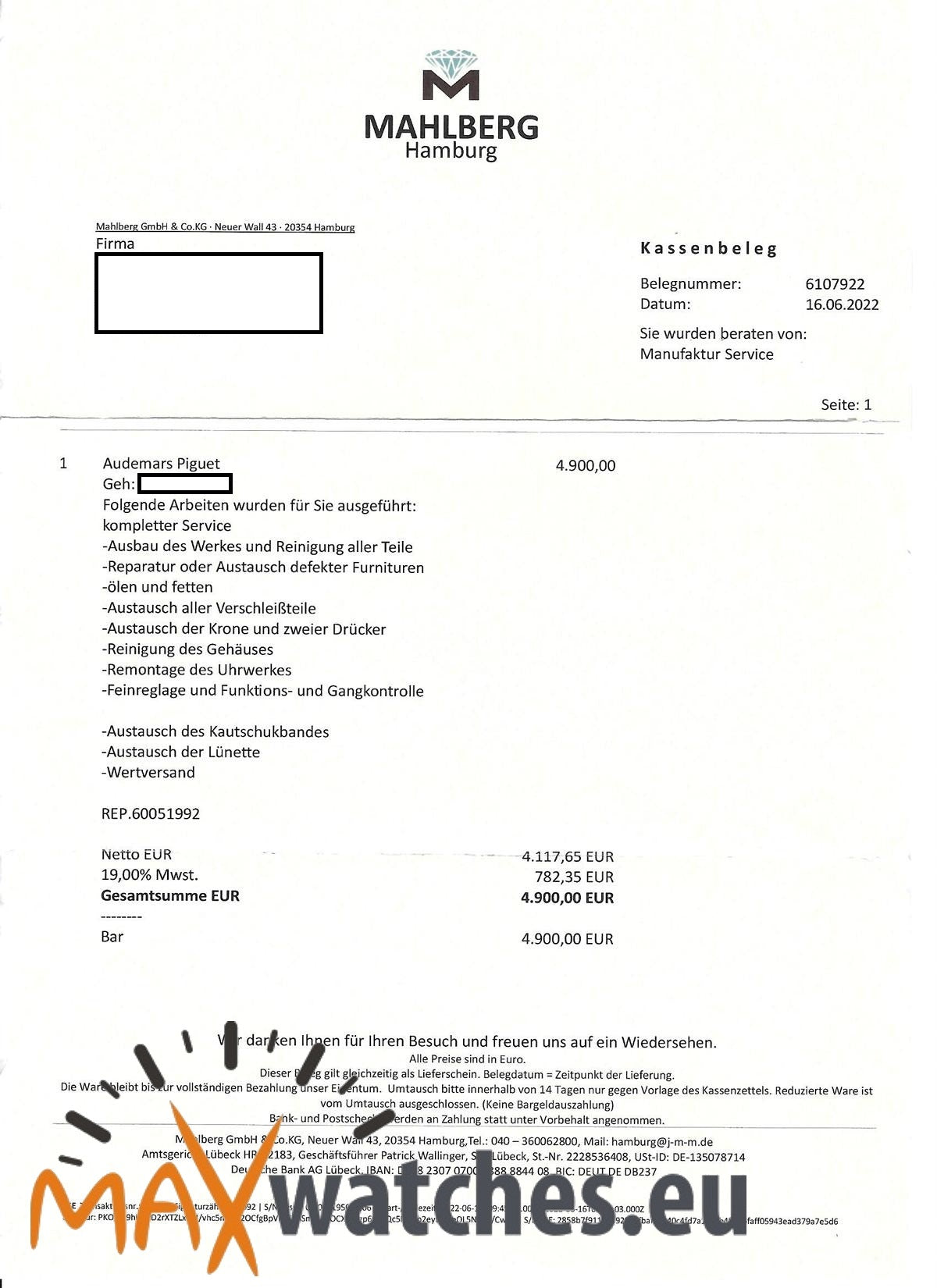 Zubehör: Original Box (beschädigt), Echtheitszertifikat und Servicerechnung (06/2022)